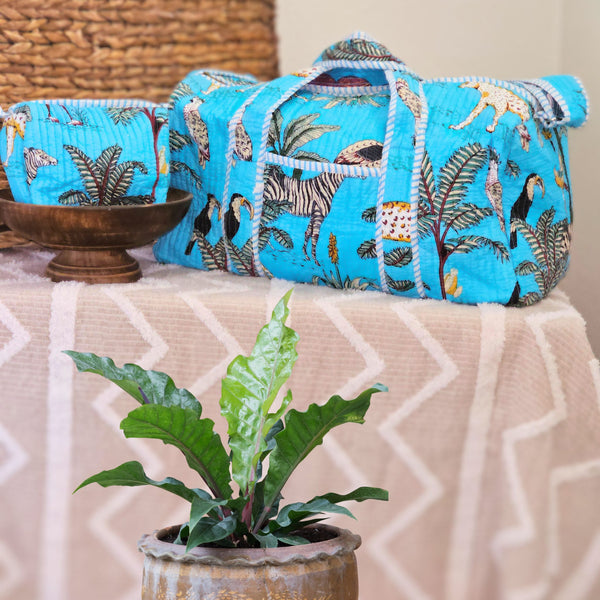 Introducing our stunning vibrant-blue weekend duffle bag! Designed to add a touch of exotic adventure to your travels. This captivating bag comes with a matching accessory bag, offering a perfect combination of style and functionality. This spacious bag is made from 100% quilted cotton, double-lined to Ensure durability and breathability. It's vibrant print is not only stunning on the outside, but also on the inside!
