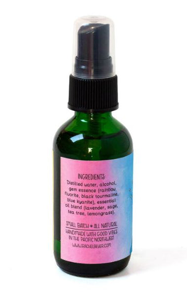 Distilled water, alcohol, rainbow fluorite, black tourmaline and blue kyanite gem essence, pure essential oils of lemongrass, lavender, tea tree and sage.