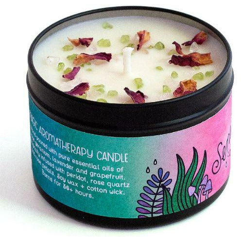 Hand-poured with pure essential oils of rose geranium, lavender and grapefruit. Each candle is magically infused with peridot, rose quartz and rose petals.