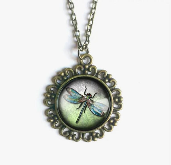 Why the dragonfly? Channel Self-realization, change, and transformation, a beautiful symbolism. Hand-crafted reversed decoupage glass cabochon earrings in elegant antiqued brass findings.