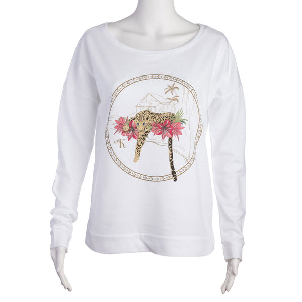 Journey on the wild side with our beloved leopard, Africa. Exotic and playful, casual and fun for a leisurely escape. Reminiscent of far-off lands, a circular pattern frames the vibrant design. Drop shoulders and a sizeable hemline create a sophisticated look.