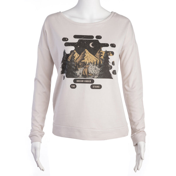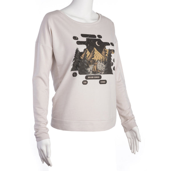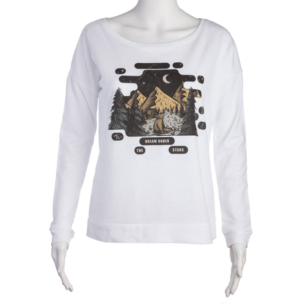 White long-sleeved pullover. Graphic includes mountains, evergreen trees, moon and stars, and a bear with flowers in her hair.